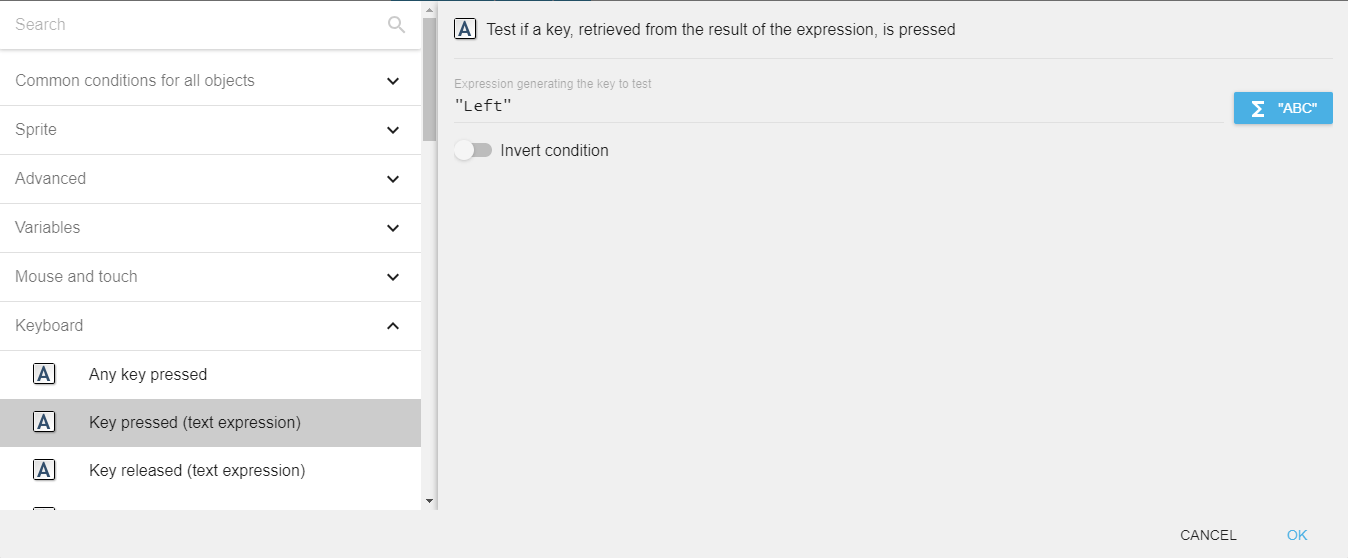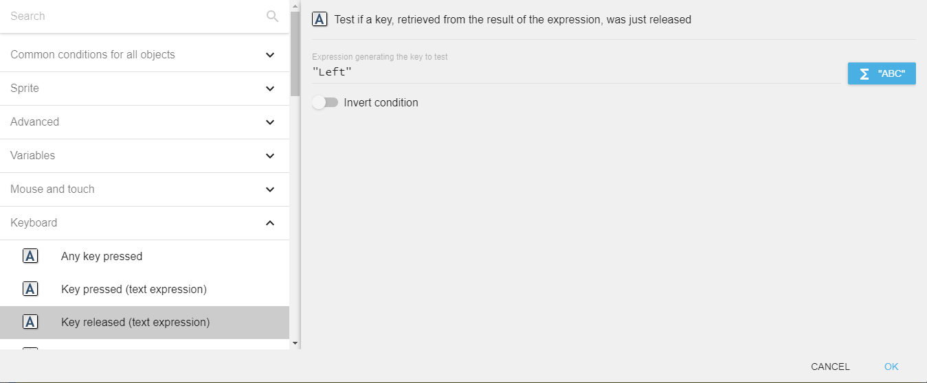 GDevelop gives access to all inputs made on the keyboard. This includes conditions to check if a key was pressed, held, or released.